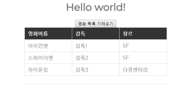 해당 코드에서는 List방식으로 데이터를 가져오기때문에 데이터 호출 성공시 <tr>.. </tr>형식의 태그를 동적으로 만들어 id가 movieList인 영역에 Data를 바인딩하고 있습니다.