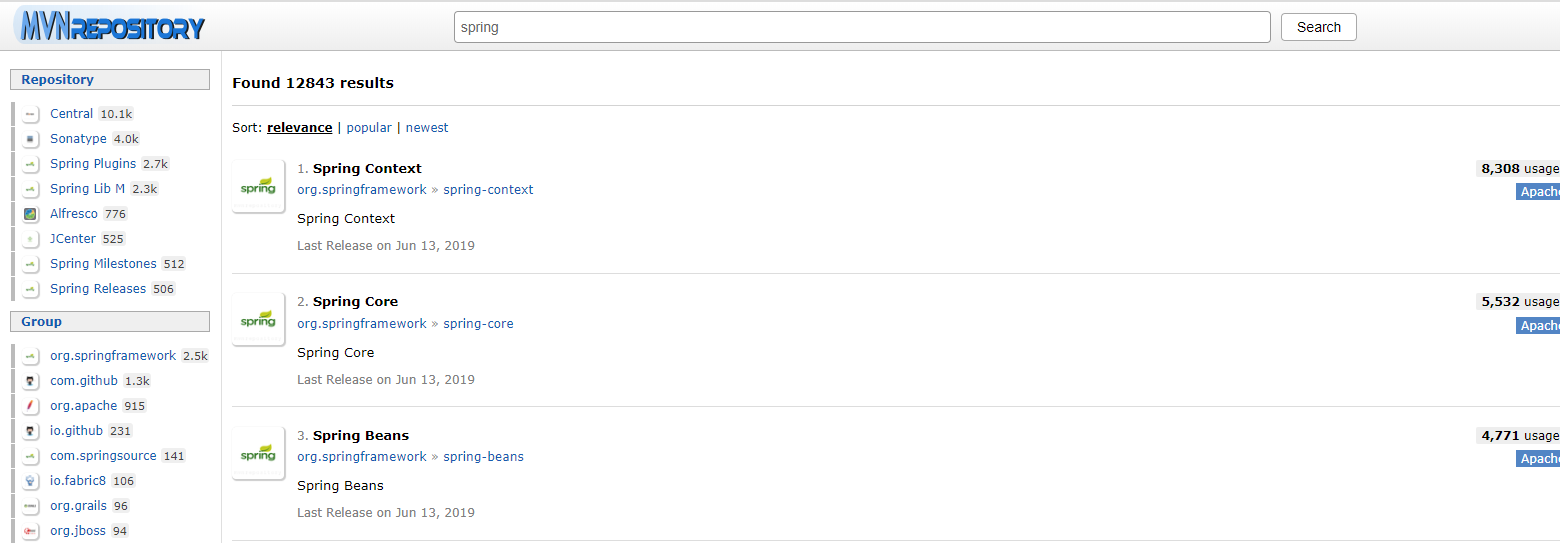 mvnrepository.com에서 spring을 검색하여 현재 버전을 검색합니다.