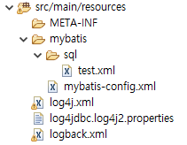 위에 설명한 바 같이 셋팅 파일과 sql을 작성하기 위해 resource 디렉토리 안에 위 그림과 같은 구조로 파일을 만듭니다.