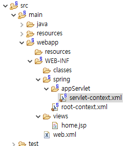 home.jsp를 호출정보는 src/main/webapp/WEB-INF/spring/appServlet/servlet-context.xml에 beans로 Views에 있는 jsp파일로 호출하겠다는 정보에서 확인 할 수 있습니다.